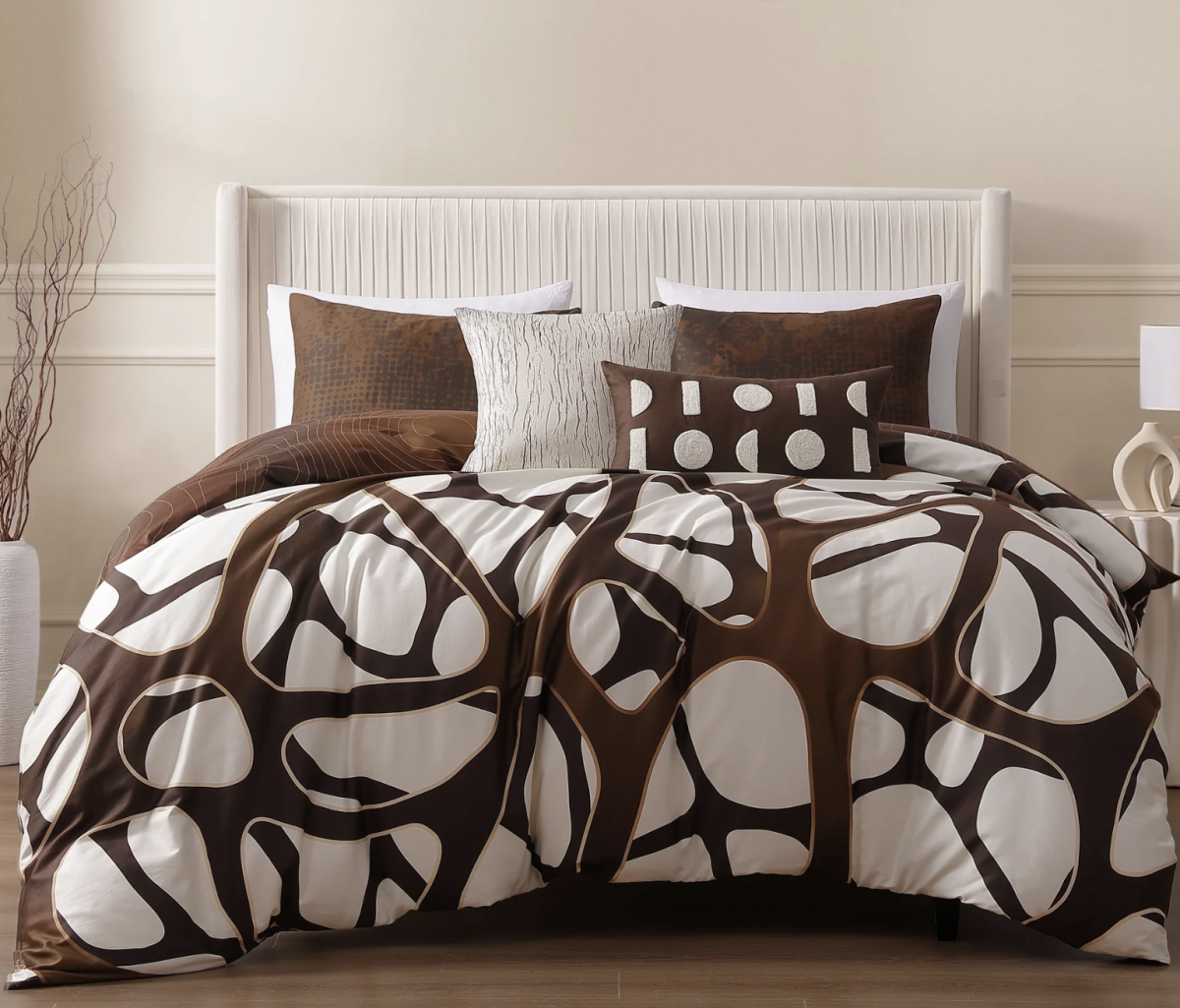 (Bebejan Toffee Web 5 Piece Reversible Comforter Set designed with warm neutral hues and an intricate geometric layout for versatile styling.)